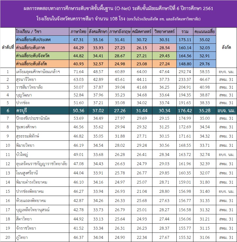 ผลการทดสอบทางการศึกษาระดับชาติขั้นพื้นฐาน (O-Net) ระดับชั้นมัธยมศึกษาปีที่ 6 ปีการศึกษา 2561 ปรากฏว่า โรงเรียนครบุรีมีคะแนนเฉลี่ยทั้ง 5 วิชา คือ ภาษาไทย สังคมศึกษา ภาษาอังกฤษ คณิตศาสตร์ และวิทยาศาสตร์ สูงเป็นลำดับที่ 6 ของโรงเรียนในจังหวัดนครราชสีมาที่สังกัดสำนักงานเขตพื้นที่การศึกษามัธยมศึกษา 31 (สพม. 31) และสังกัดองค์การบริหารส่วนจังหวัดนครราชสีมา รวมทั้งหมด 108 โรง (ยกเว้นโรงเรียนสังกัดสำนักงานคณะกรรมการส่งเสริมการศึกษาเอกชน และมหาวิทยาลัย) ซึ่งถือว่าเป็นลำดับที่ดีที่สุดของโรงเรียนตั้งแต่มีการจัดทดสอบทางการศึกษาระดับชาติขั้นพื้นฐาน (O-Net) ระดับชั้นมัธยมศึกษาปีที่ 6 เป็นต้นมา ส่วนผลโอเน็ต ระดับชั้นมัธยมศึกษาปีที่ 3 ปีการศึกษา 2561 นั้น โรงเรียนครบุรีก็ติด 10 อันดับแรกของจังหวัดเช่นกัน โดยมีคะแนนรวมสูงเป็นลำดับที่ 9 ของจังหวัดนครราชสีมา