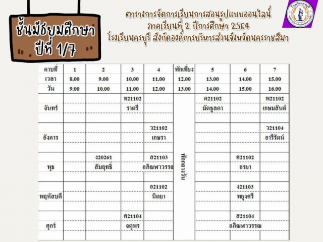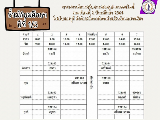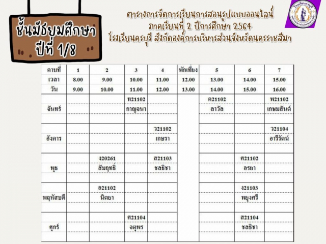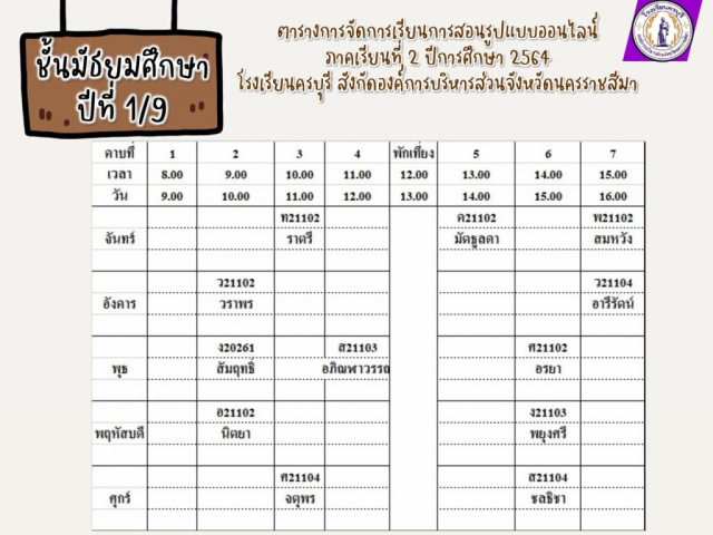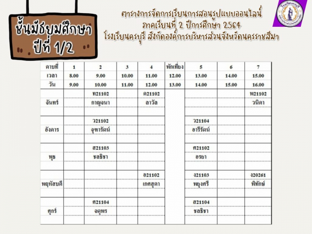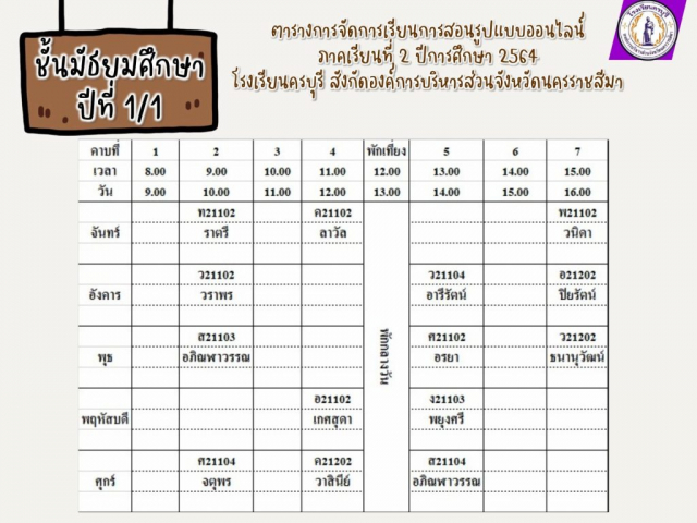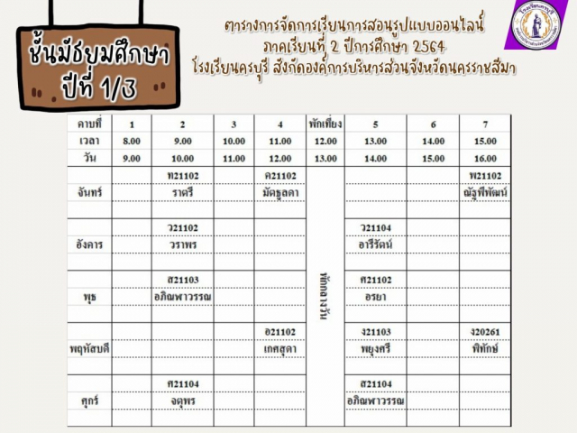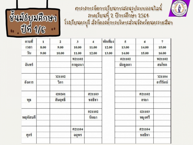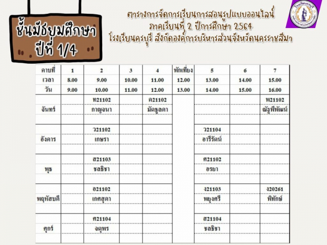 ตารางการจัดการเรียนการสอนรูปแบบ Online, On-hand, On-demand ภาคเรียนที่ 2 ปีการศึกษา 2564 ชั้นมัธยมศึกษาปีที่ 1 (คลิกที่รูปเพื่อดูรูปขยาย) 13/11/2021 by admin ร่วมแบ่งปันให้เพื่อน