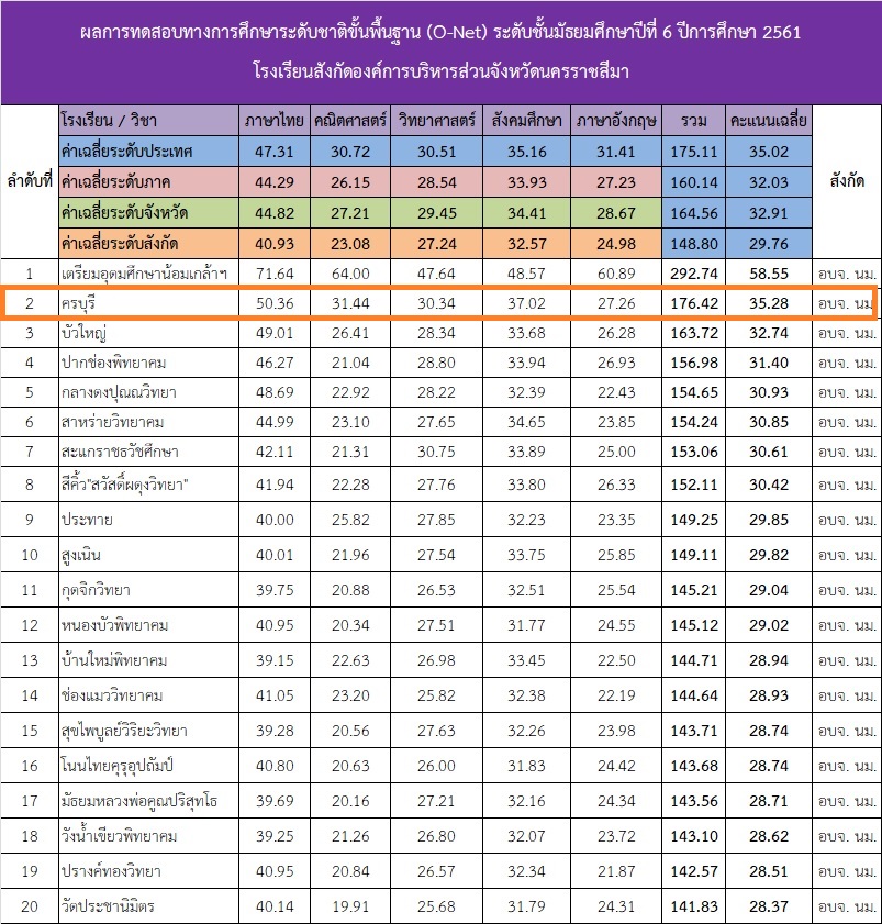โรงเรียนครบุรียังคงรักษามาตรฐานการทดสอบทางการศึกษาระดับชาติขั้นพื้นฐาน (O-Net) ระดับชั้นมัธยมศึกษาปีที่ 6 ปีการศึกษา 2561 เหมือนเช่นทุก ๆ ปีที่ผ่านมา โดยมีคะแนนรวมสูงสุดเป็นอันดับที่ 2 ของโรงเรียนสังกัดองค์การบริหารส่วนจังหวัดนครราชสีมา ซึ่งมีจำนวนทั้งหมด 58 โรงด้วยกัน โดยอันดับที่ 1 ยังคงเป็นโรงเรียนเตรียมอุดมศึกษาน้อมเกล้า นครราชสีมา เช่นเดิม เนื่องจากเป็นโรงเรียนแบบพิเศษ มีการจัดสอบคัดเลือกนักเรียนระดับหัวกะทิจากอำเภอต่าง ๆ เพื่อเข้าศึกษาต่อ ตลอดจนมีการจัดการเรียนการสอนแบบเข้มข้นอย่างต่อเนื่อง