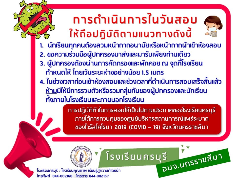 การปฏิบัติตนตามข้อปฏิบัติและมาตรการเพื่อการป้องกันเกี่ยวกับการแพร่ระบาดของโรคไวรัสโคโรนา 2019 ในวันสอบวัดความรู้เพื่อเข้าศึกษาต่อชั้นมัธยมศึกษาปีที่ 1 ห้องเรียนส่งเสริมความสามารถพิเศษของนักเรียนด้านวิทยาศาสตร์ คณิตศาสตร์ ภาษาอังกฤษและเทคโนโลยี (SMET) ประจำปีการศึกษา 2564 ในวันพุธที่ 19 พฤษภาคม พ.ศ. 2564