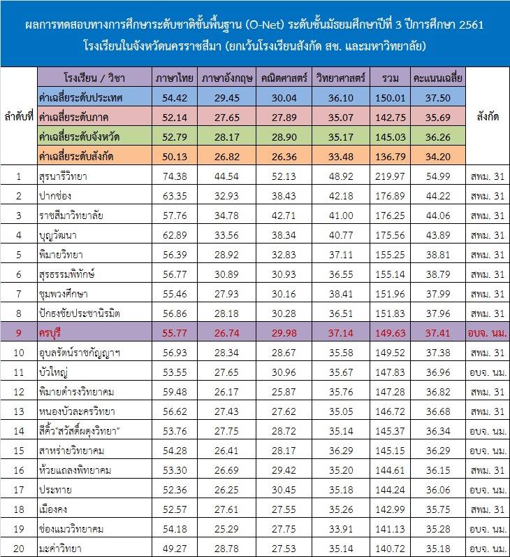 ผลการทดสอบทางการศึกษาระดับชาติขั้นพื้นฐาน (O-Net) ระดับชั้นมัธยมศึกษาปีที่ 3 ปีการศึกษา 2561 ปรากฏว่า โรงเรียนครบุรีมีคะแนนเฉลี่ยทั้ง 4 วิชา คือ ภาษาไทย ภาษาอังกฤษ คณิตศาสตร์ และวิทยาศาสตร์ สูงเป็นลำดับที่ 9 ของโรงเรียนในจังหวัดนครราชสีมาที่สังกัดสำนักงานเขตพื้นที่การศึกษามัธยมศึกษา 31 (สพม. 31) และสังกัดองค์การบริหารส่วนจังหวัดนครราชสีมา รวมทั้งหมด 107 โรง (ยกเว้นโรงเรียนสังกัดสำนักงานคณะกรรมการส่งเสริมการศึกษาเอกชน และมหาวิทยาลัย) ซึ่งเมื่อปีการศึกษา 2559 ที่ผ่านมา โรงเรียนครบุรีมีผลโอเน็ต ระดับชั้น ม. 3 อยู่ในลำดับที่ 7 ของจังหวัดนครราชสีมา