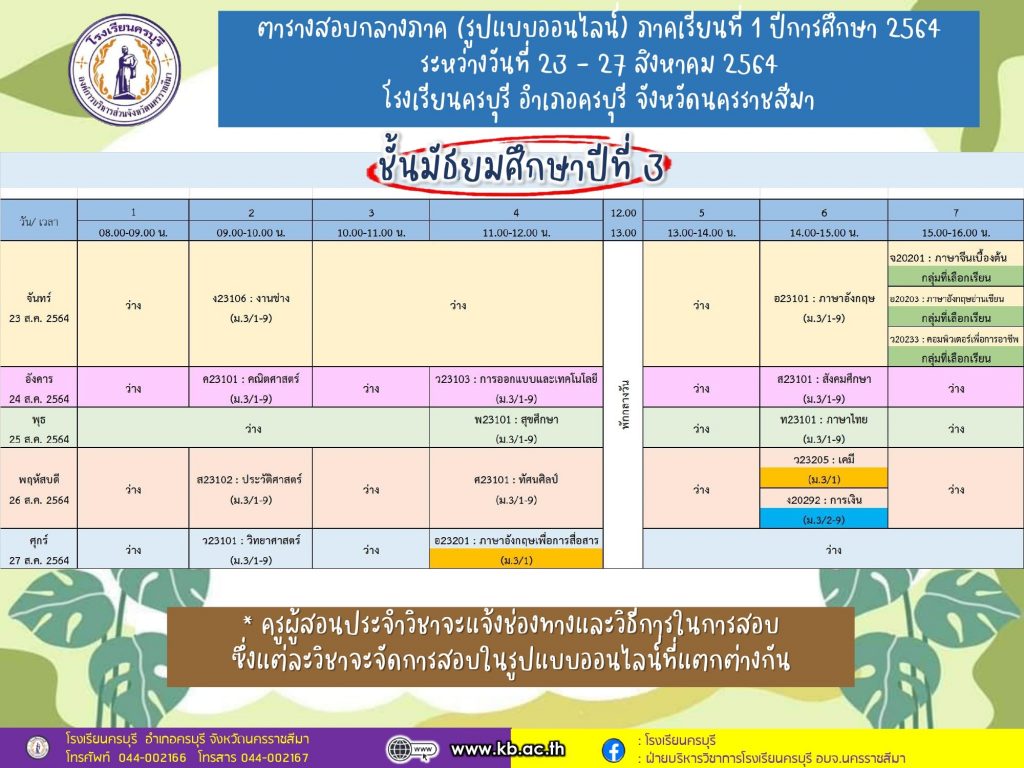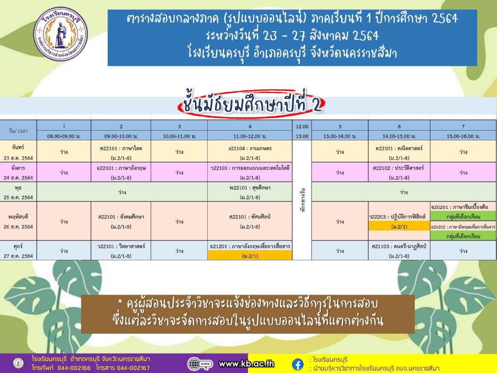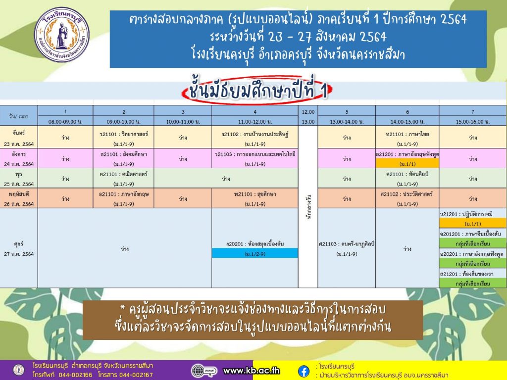 ตารางสอบกลางภาคออนไลน์ ภาคเรียนที่ 1/2564 (ม.ต้น) 17/08/2021 by admin ตารางสอบกลางภาค (รูปแบบออนไลน์)ภาคเรียนที่ 1 ปีการศึกษา 2564 ระหว่างวันที่ 23 – 27 สิงหาคม 2564 ครูผู้สอนประจำวิชาจะแจ้งช่องทางและวิธีการในการสอบซึ่งแต่ละวิชาจะจัดการสอบในรูปแบบออนไลน์ที่แตกต่างกัน ร่วมแบ่งปันให้เพื่อน