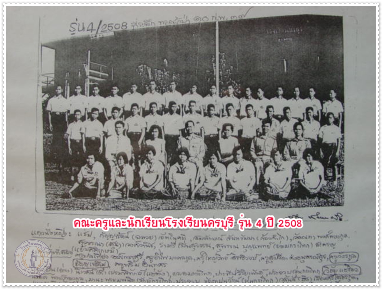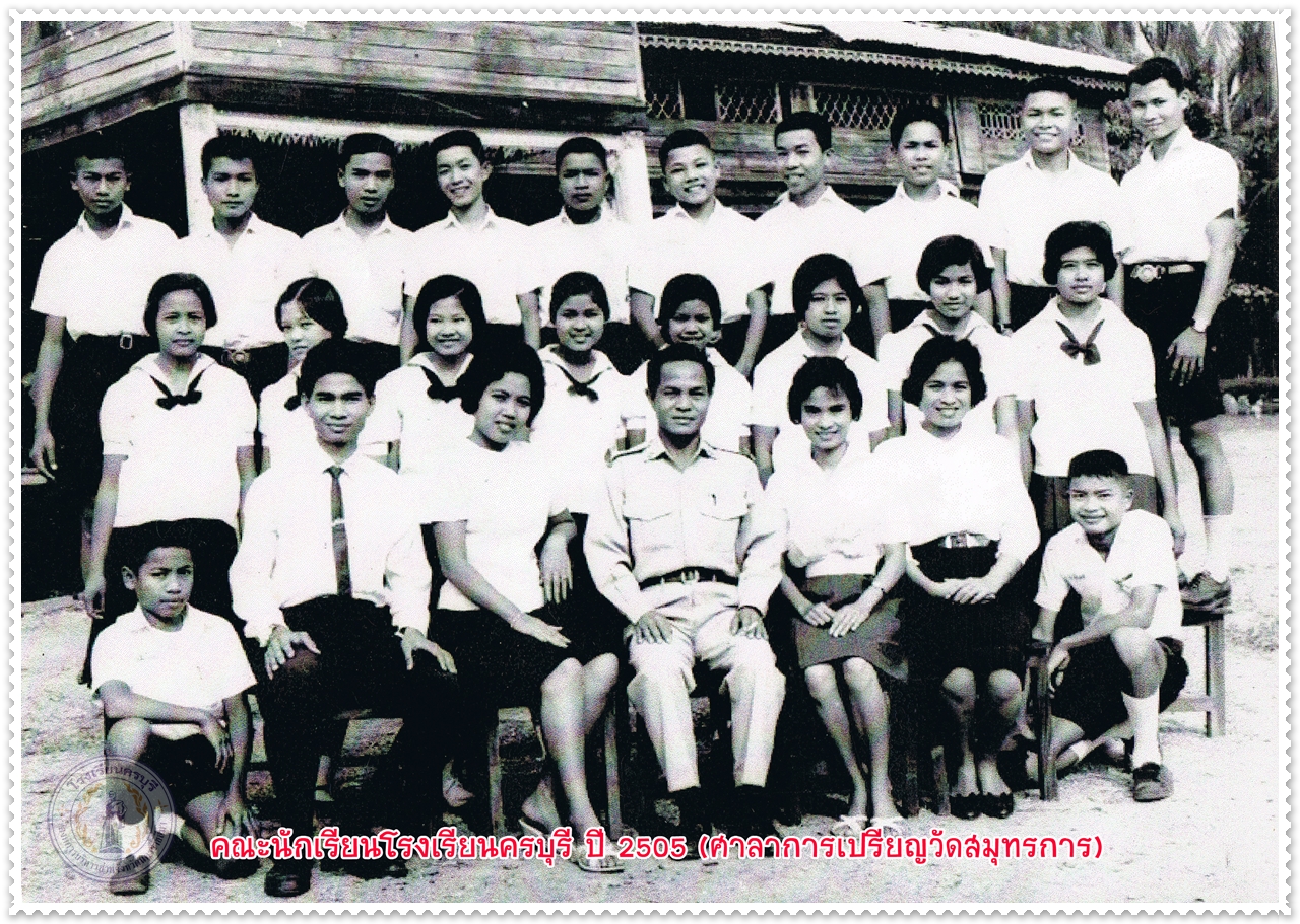 ภาพขาว-ดำ 14/05/2021 by admin ภาพขาว-ดำที่สื่อถึงความเป็นมาของโรงเรียนครบุรีในสมัยแรกเริ่มซึ่งอยู่ที่ศาลาการเปรียญวัดสมุทรการ (แชะ) จนถึงการย้ายมาตั้ง ณ สำนักงานสาธารณสุขอำเภอครบุรี และที่ตั้งของโรงเรียนในปัจจุบัน ร่วมแบ่งปันให้เพื่อน