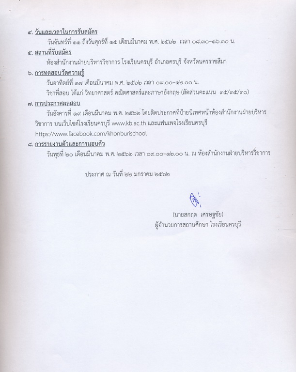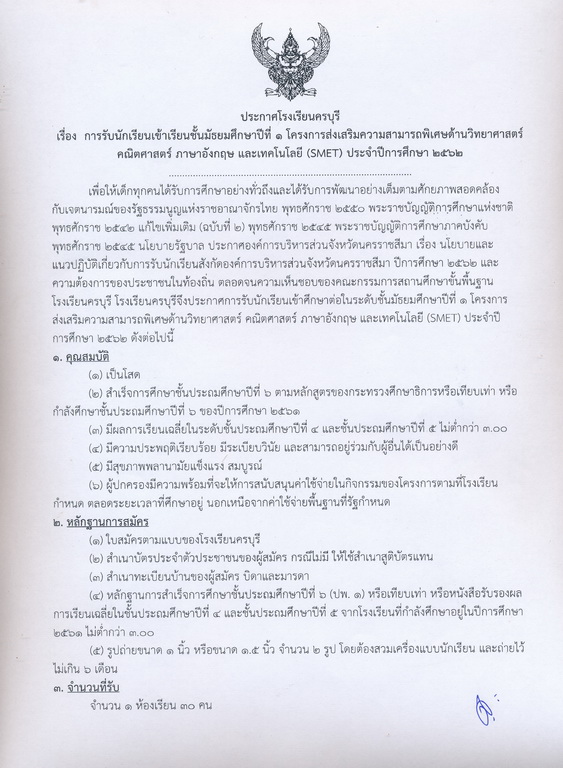 โรงเรียนครบุรีรับสมัครนักเรียนเพื่อศึกษาต่อในระดับชั้นมัธยมศึกษาปีที่ 1 โครงการส่งเสริมความสามารถพิเศษด้านวิทยาศาสตร์ คณิตศาสตร์ ภาษาอังกฤษ และเทคโนโลยี (SMET) ประจำปีการศึกษา 2562 ระหว่างวันที่ 11-15 เดือนมีนาคม พ.ศ. 2562 ณ ห้องสำนักงานฝ่ายบริหารวิชาการ